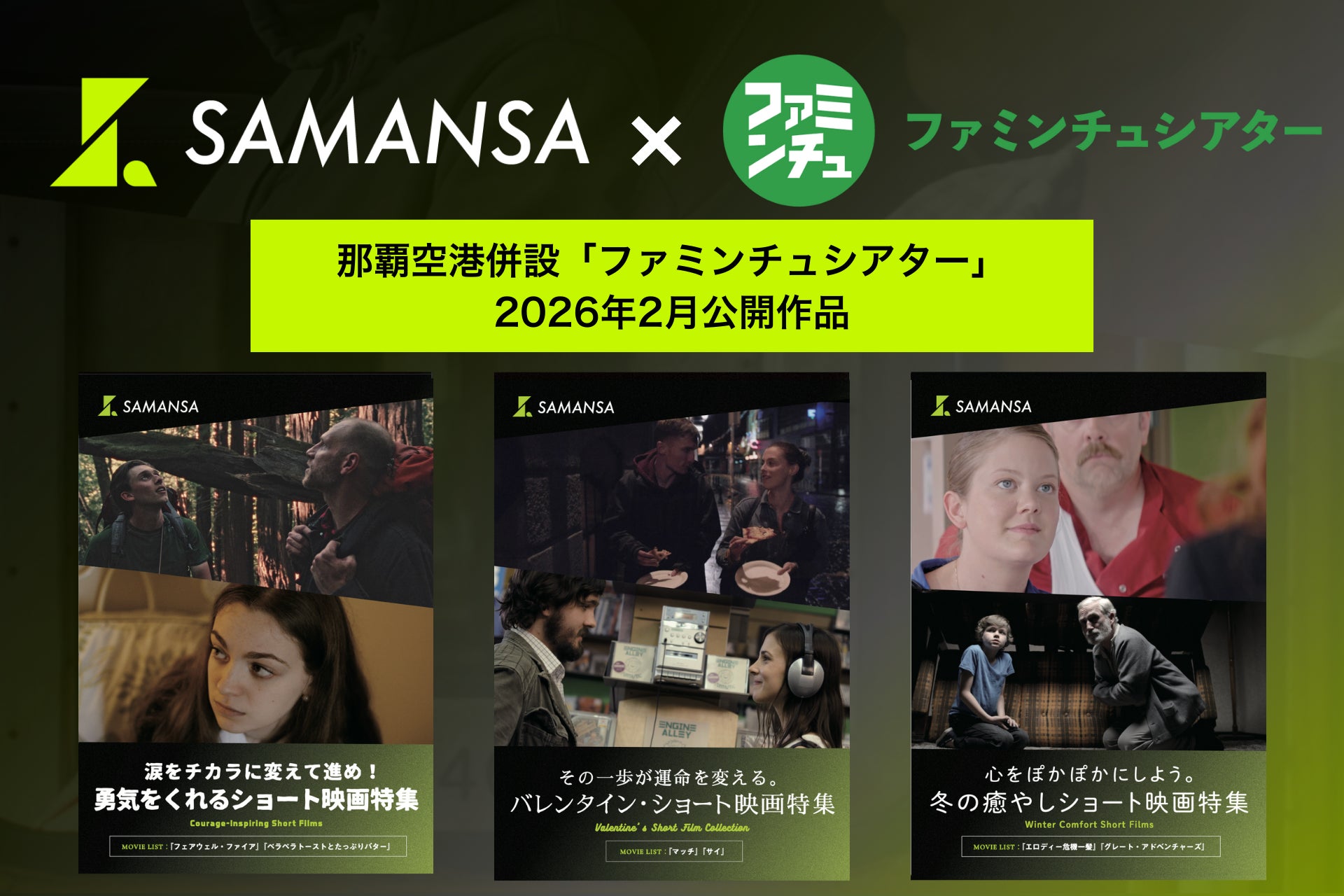 株式会社SAMANSA(本社:東京都渋谷区、代表取締役社長:岩永 祐一、共同代表:遠山 孝行)は、有限会社チャオジャパントレーディング(本社:沖縄県那覇市、代表取締役社長:洲鎌 一馬)が那覇空港で展開する「ファミンチュシアター」において2月1日より、新たな作品を公開することをお知らせいたします。今月は『その一歩が運命を変える。バレンタイン・ショート映画特集』『涙をチカラに変えて進め!勇気をくれるショート映画特集』 『心をぽかぽかにしよう。冬の癒やしショート映画特集』の3パッケージ、計6本を公開。