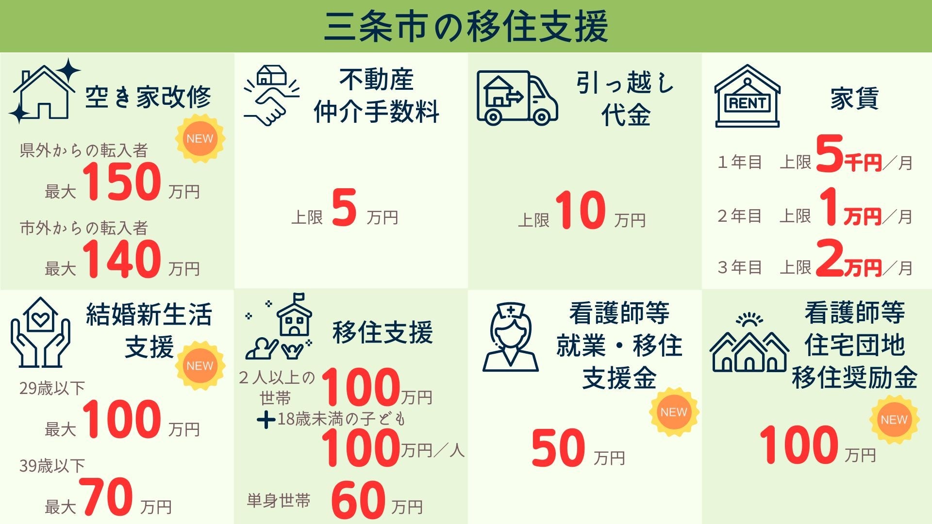 三条市空き家・空き地バンクの登録物件に入居するときに必要な改修費等の補助額について、これまで上限50万円補助していたものを、最大上限150万円に拡大します。