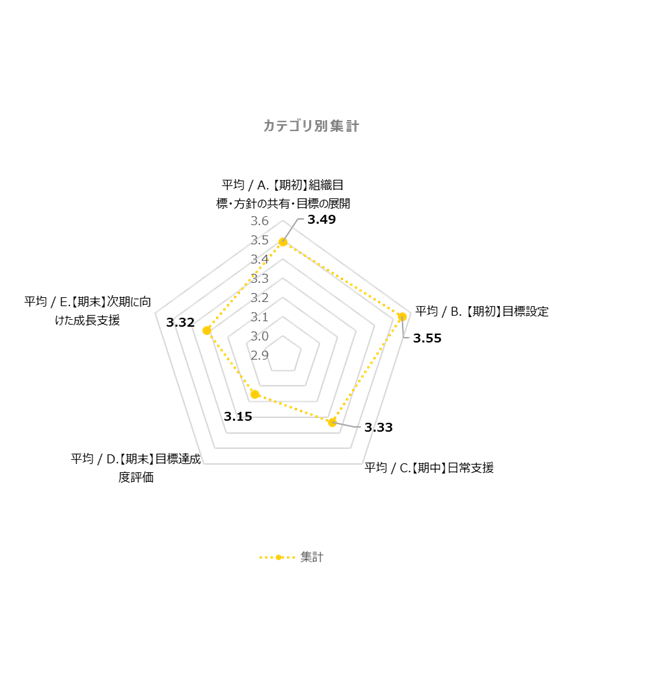 ・期初(A~B)の得点は比較的高かったものの、個別の質問の回答をみると、「組織目標の説明・共有」に比べ、「個々の役割分担」「個別の能力・資質を考慮したアサイン」と得点が下がる傾向がみられました。
