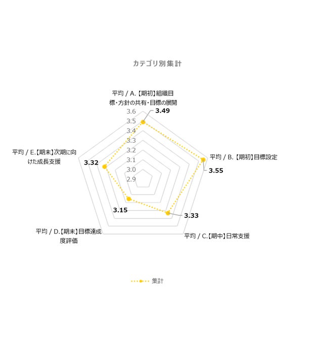 ・カテゴリ別の質問(5件法、各3問)の平均値を集計したところ期初(A~B)における得点が高く、期末(特にD)の得点が低いという結果になりました。