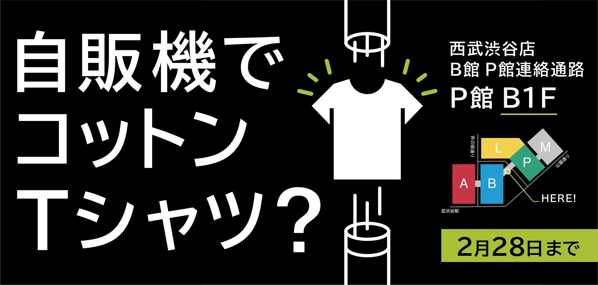 ・西武渋谷店 B館L館連絡通路B1Fに2022年2月28日(月)まで期間限定で設置されているコットンTシャツが買える自販機の機体として、イノベーション自販機が選ばれました。今回の自販機では、環境に配慮したクラフト紙を用いた梱包容器にTシャツが、主に500円のワンコインで販売されています。