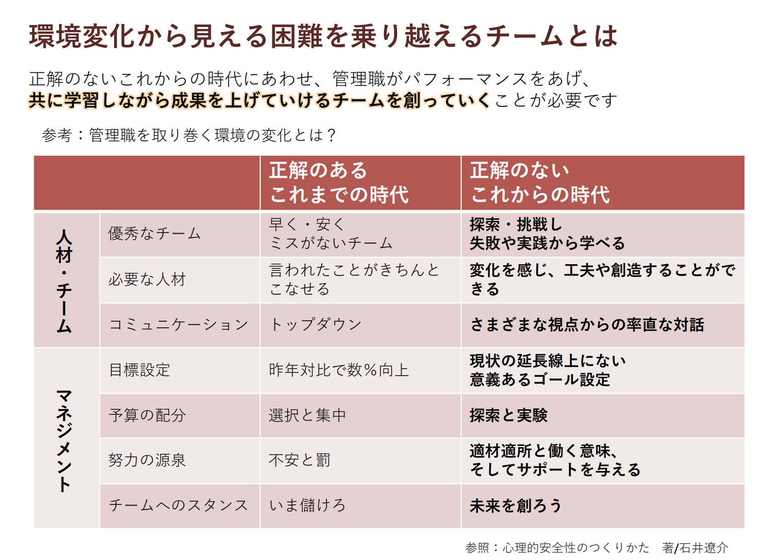 正解のないこれからの時代にあわせ、管理職がパフォーマンスをあげ、共に学習しながら成果を上げていけるチームを創っていく