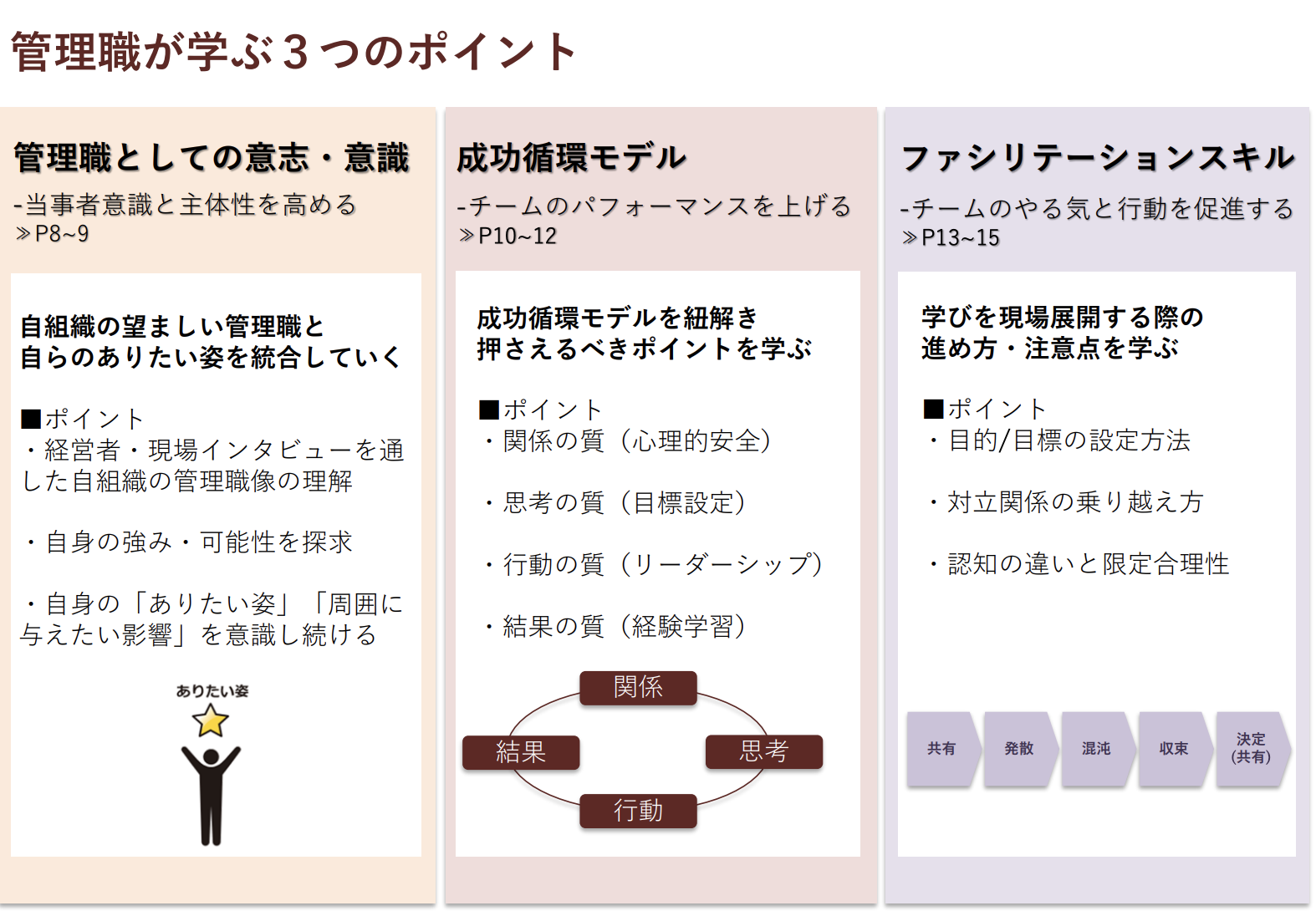 本プログラムは、変化に適応し管理職自身と管理職をふくめたチームが今後も成果をだし続け、活躍していけるきっかけを提供したいと、開発しました。