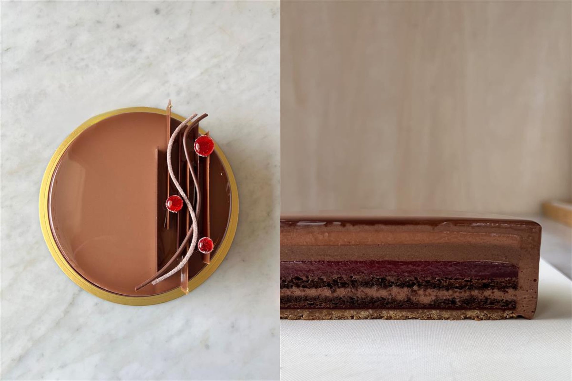 「飾りや見た目はシンプルでも綺麗に作ることを心掛けました。味覚はチョコレート、紅茶、フランボワーズ、ローズの構成で香りも豊かに。ローズはどうしても香りが強く出過ぎてしまうので、自家製ピューレを作る際に少し香りを移し、ほのかにローズが香る上品なケーキに仕上げました。」