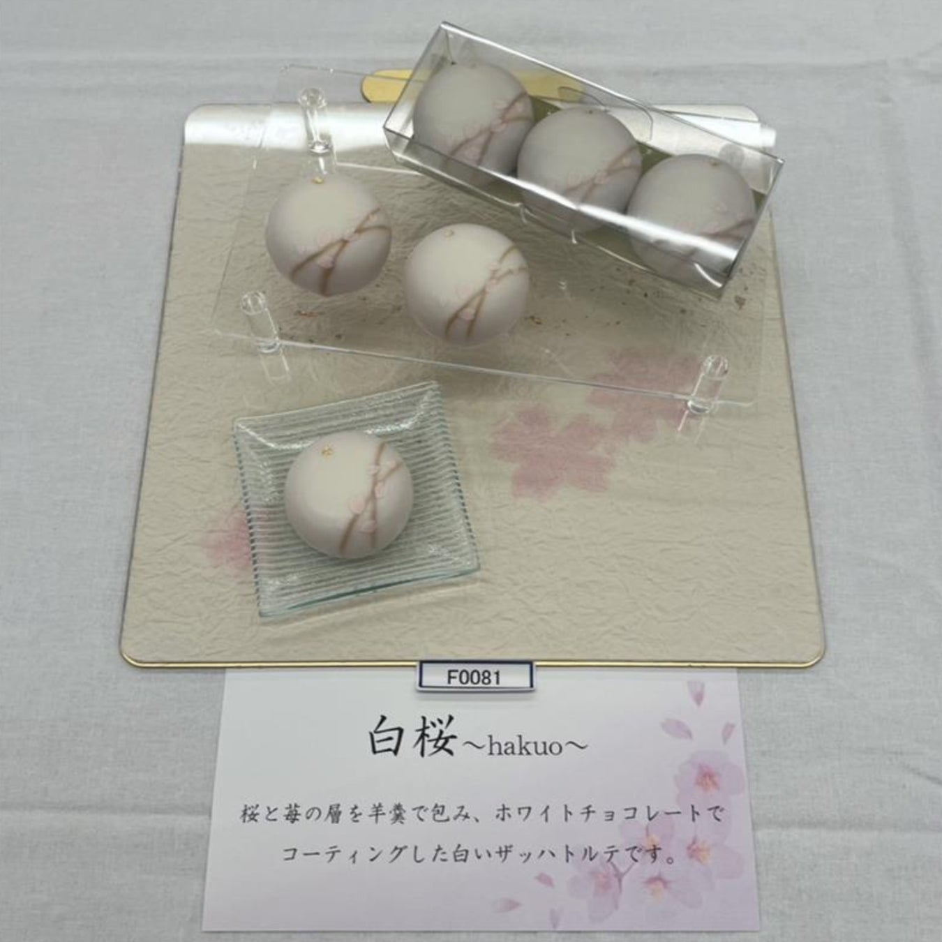 「今までにないザッハトルテを作りたいと思い、今回の作品を作りました。見た目はホワイトチョコレートを使用し、仕上げにグラスアローをかけてザッハトルテのような食感を表現。味は日本らしさを出すために、桜の香りが楽しめるカステラを自家製の桜餡で包み込みました。」