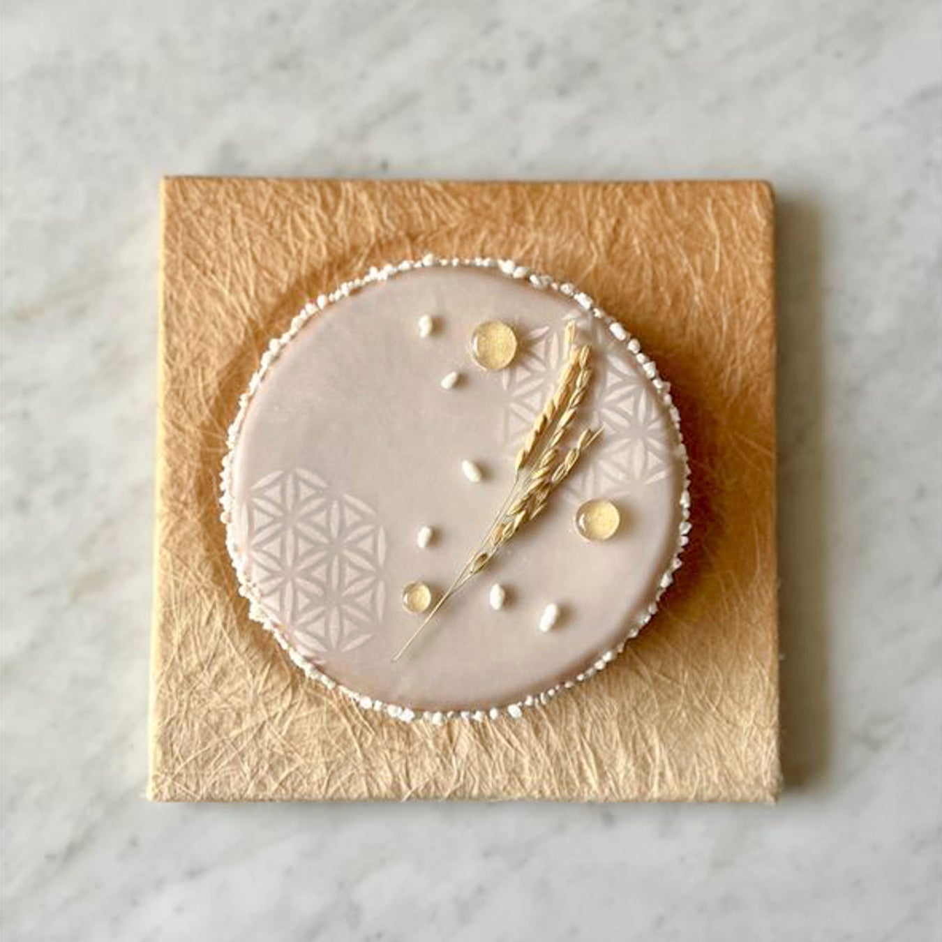 「米粉本来の素材の特性を生かしながら、リンゴとキャラメルをベースにタルトやケーク生地をベースに作りました。中には自家製の焼きリンゴピューレで作ったジャムや、リンゴのパートドフリュイを挟んだ生地を入れて食感も楽しめる構成です。見た目は“お米の白さ”と“秋のお月見”をイメージしてデザインしました。」