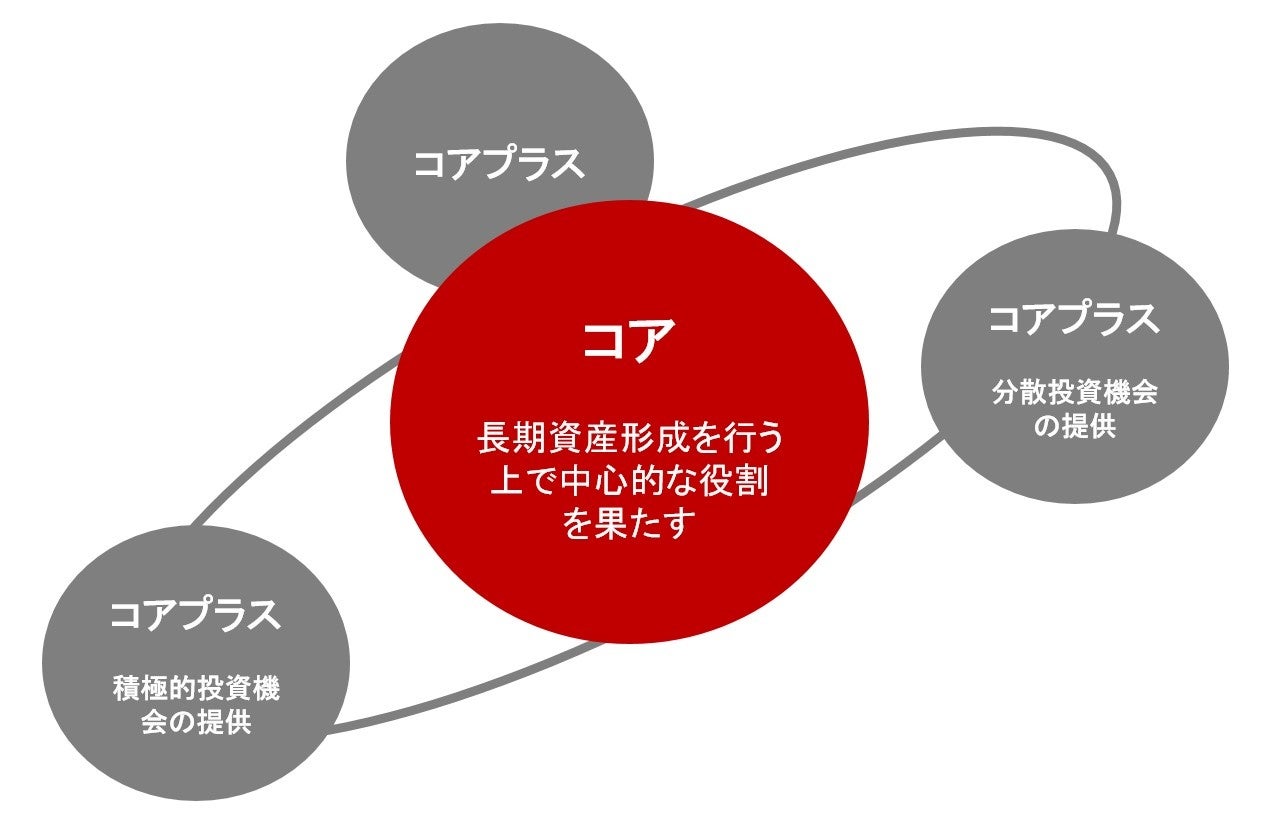 これに併せて本年度より、当社の全ての公募投資信託を、長期的資産形成の上で中心的な役割を果たすと考えられる「コア(ファンド)」と、積極的投資機会や分散投資機会等の提供を目的とする「コアプラス(ファンド)」に分類します。これにより、高い付加価値の商品ポートフォリオを分かりやすいかたちで提供する体制を目指します。