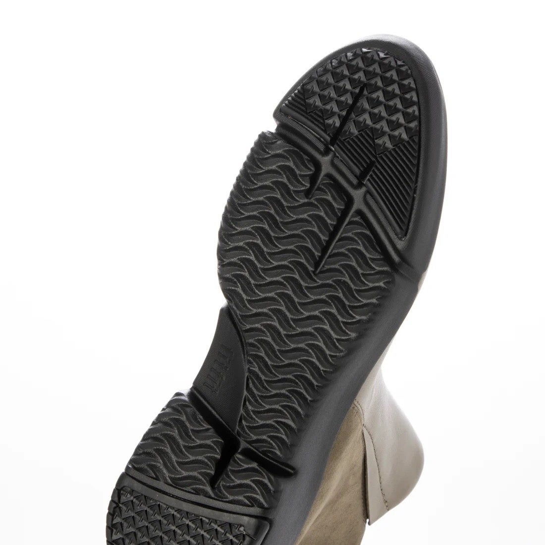 2. アッパーにはやわらかなレザーと、両サイドには深い位置までゴムを施すことで、足あたりが良く、足の動きに合わせてフレキシブルに動くため、歩きやすくやさしい履き心地に仕上げました。