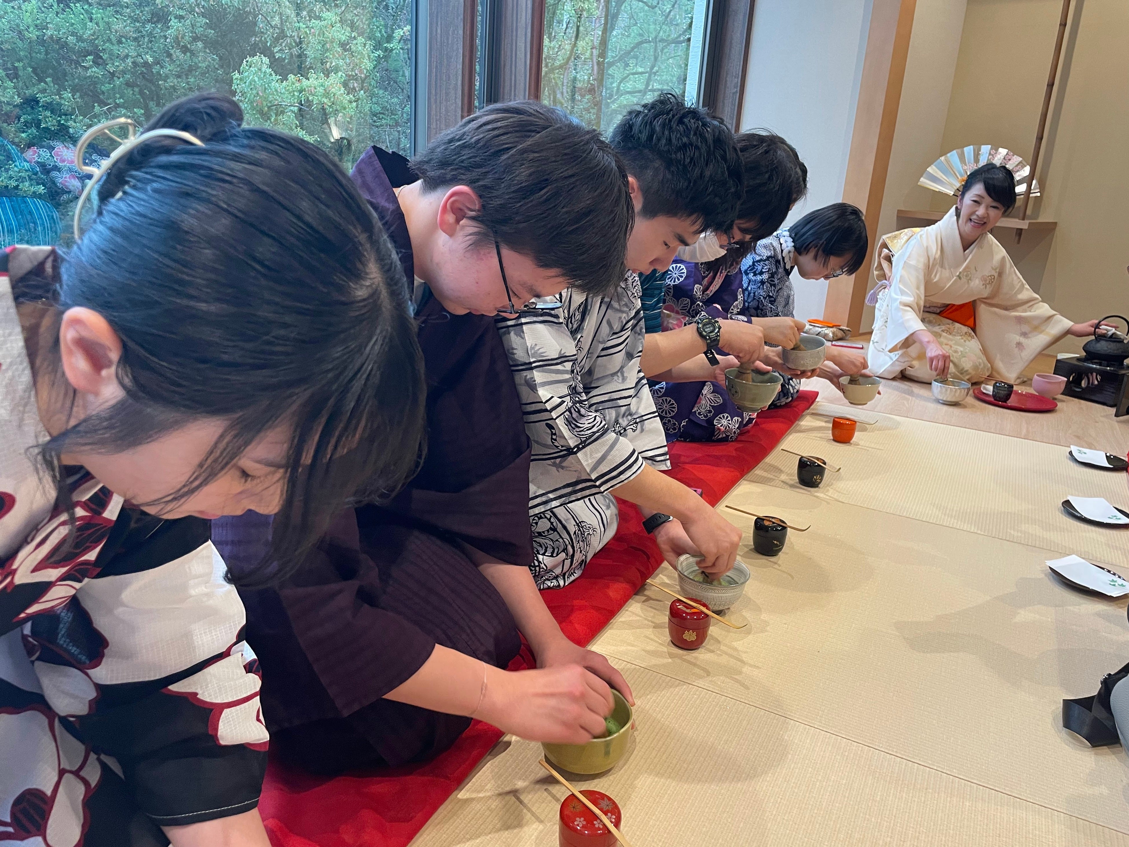 日本文化体験では、浴衣の着付け、茶道、弓道を実施。特に海外から国際高等学校に入学した生徒は初めて浴衣を着る生徒も多く、思い思いの色や柄を選び、いつもとは一味違う華やかな雰囲気に学校中が包まれました。また、最後には浴衣特有の畳み方を学び、苦戦しながらも楽しく体験している様子でした。茶道体験では事前にお茶の点て方やお茶とお菓子の出し方を練習し、アート・パフォーマンス・デイで保護者をもてなしました。保護者はお茶とお菓子を楽しみながら、「心がこもっていてとても美味しかったよ」と伝える場面もありました。そして、この日を締めくくる弓道体験。国際高等学校の生徒は体育の種目の一つとして弓道を行っています。そのため、作法や弓を射るやり方を保護者に教えながら、参加者全員で楽しみました。