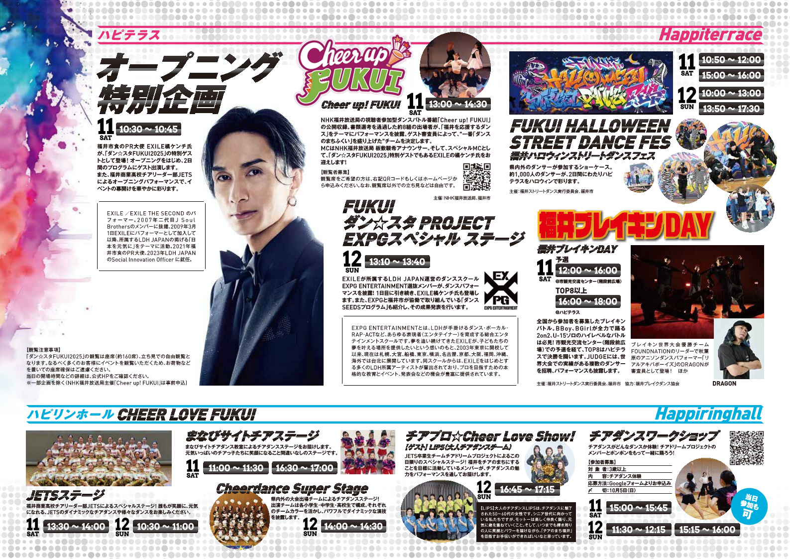 2024年度から、福井の未来を創るこどもたちにダンスの授業を通して特別な体験を提供する〈ダンスSEEDSプログラム〉と〈福井市の秋にダンスの祭典を!〉という2つの想いを具現化すべく、LDH JAPANのサポートを受けて『FUKUIダン☆スタPROJECT』が始動しました。このプロジェクトのイベントパート『ダン☆スタFUKUI 2025』が、2025年10月11日(土)、12日(日)の2日間、福井市内の3会場で正式なスタートを迎えました。当日は橘ケンチ氏がオープニングの他様々なコンテンツに登場しました。また、LDH JAPANのEXPG ENTERTAINMENTからEXPG STUDIO選抜チームも参戦して両日の駅周辺を大いに盛り上げました。