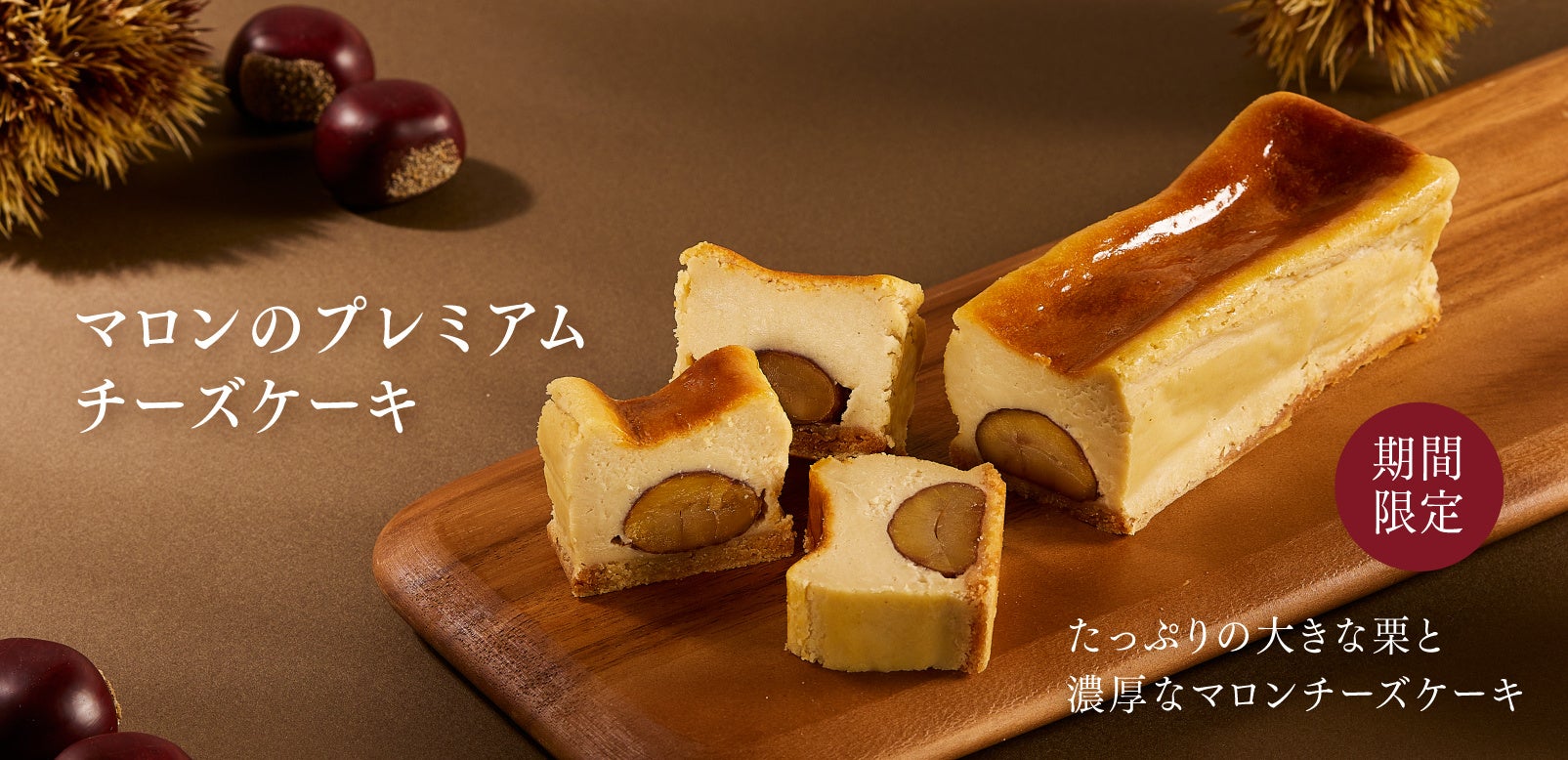 濃厚なマロンチーズケーキとたっぷり入った渋皮栗が魅力の秋スイーツ「マロンのプレミアムチーズケーキ」。