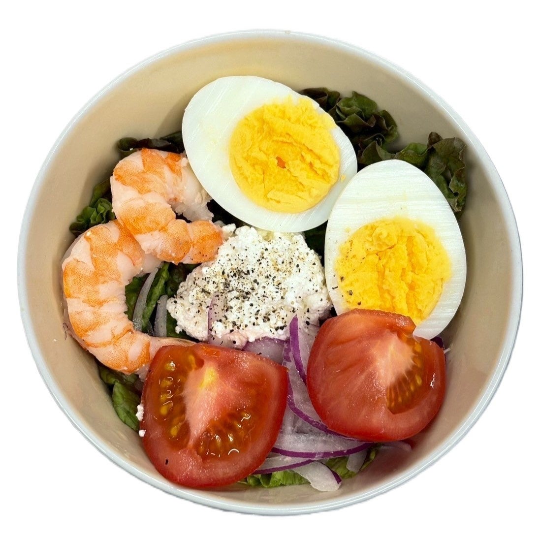 爽やかなレモンチーズケーキマグに、プリプリのエビ・ゆでたまご・カッテージチーズでタンパク質をしっかりチャージ。