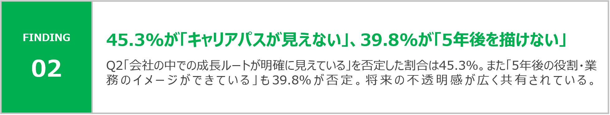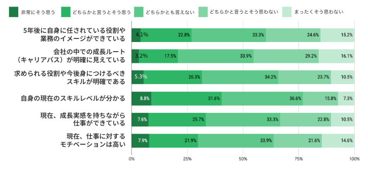 「仕事に対するモチベーションは高い」の否定層が36.2%に達し、キャリアの見通しの不透明さがエンゲージメント低下に直結していることが示唆される