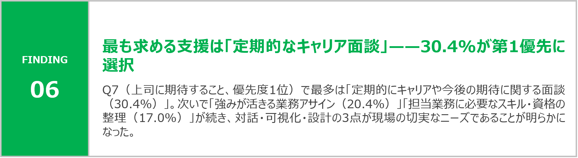 1位期待:定期的なキャリア・期待に関する面談(30.4%) → Q6の実施実感との乖離が最も大きい施策
