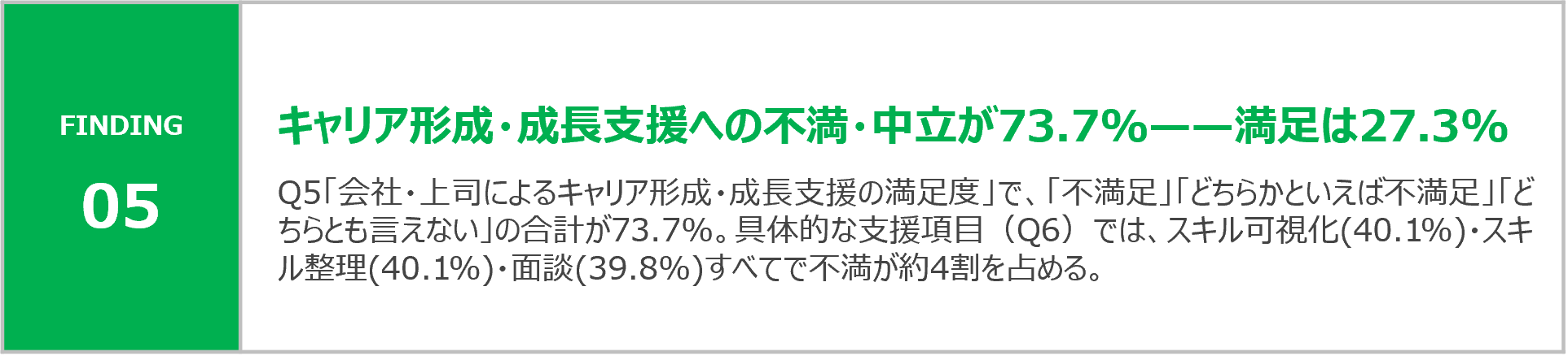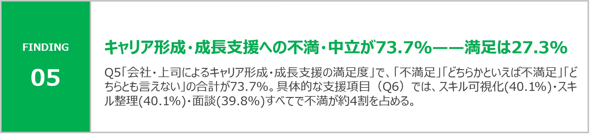 調査の結果、製造業の技能職・技術職において①働きがいの停滞、②キャリアパスの不透明さ、③会社・上司によるキャリア支援の不足という3つの課題が連動して発生していることが明らかになりました。特に「支援への不満」と「成長実感の喪失」は強く結びついており、キャリア面談の機会提供・スキルの可視化・キャリアパスの明示という具体的な施策の不在が、現場の「働きがい喪失」構造の根本にあることが示されています。