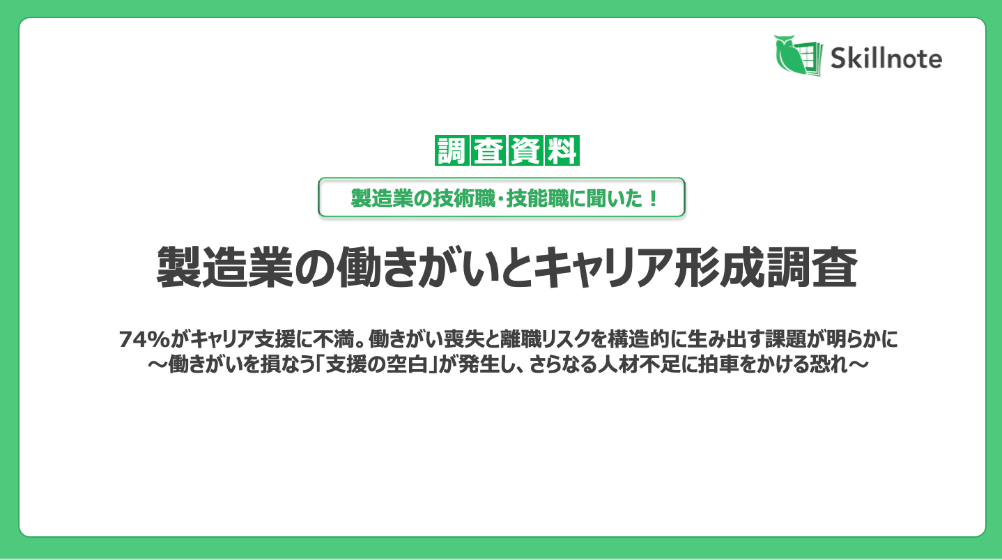 製造業の人材不足をスキルデータで解決する株式会社Skillnote(本社 東京都千代田区、代表取締役 山川隆史、以下 Skillnote)が運営する「スキルマネジメント研究所」は、製造業の技術職(※1)と技能職(※2)342名を対象とした「働きがいとキャリア形成に関する実態調査2026」を実施しました。その結果、会社・管理職によるキャリア支援への不満・中立は74%にのぼり、「キャリアパスが見えない(45.3%)」「5年後の成長イメージが描けない(39.8%)」という声が約4割を超えました。面談機会の不足、スキル可視化の欠如、キャリアパスの不透明さという3つの「支援の空白」が、働きがい喪失と離職リスクを構造的に生み出していることが明らかになりました。