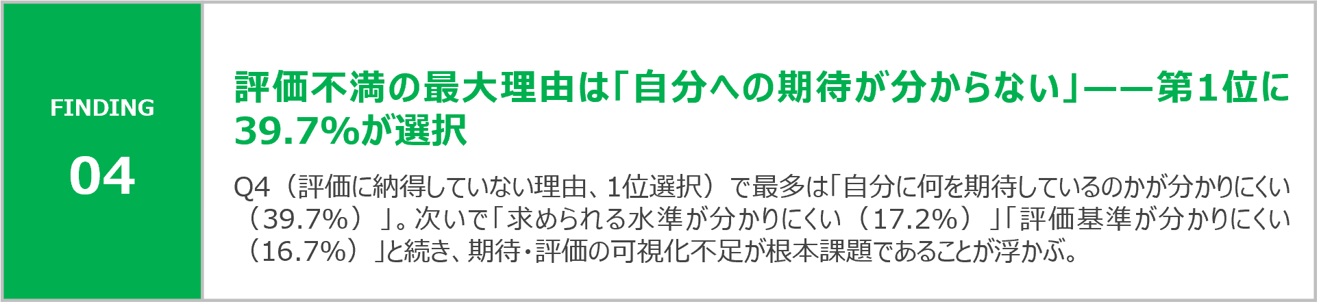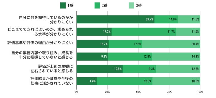 「求められる水準が分かりにくい」「評価基準・理由が分かりにくい」が続き、評価の透明性・言語化の欠如が共通課題として浮かび上がる