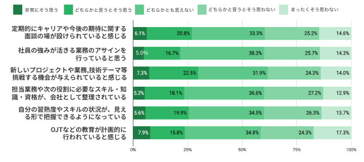 特に「OJTの計画的実施」は否定最多(41.6%)で、育成の計画性・体系性の欠如が際立つ