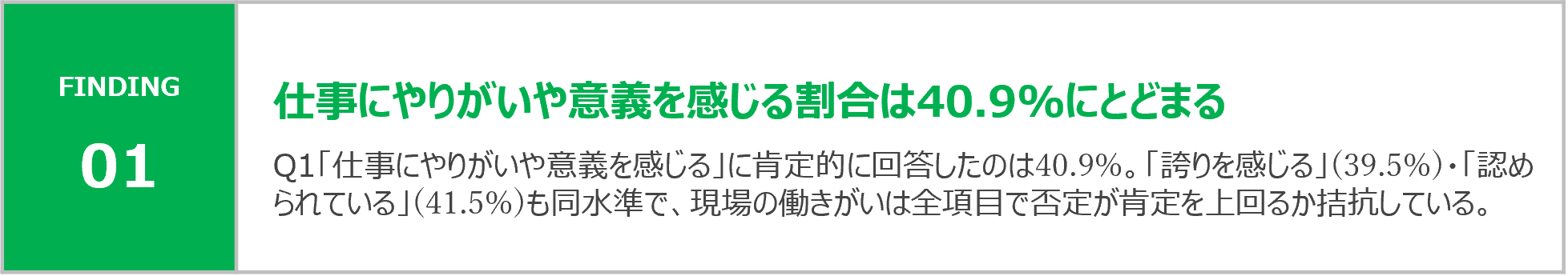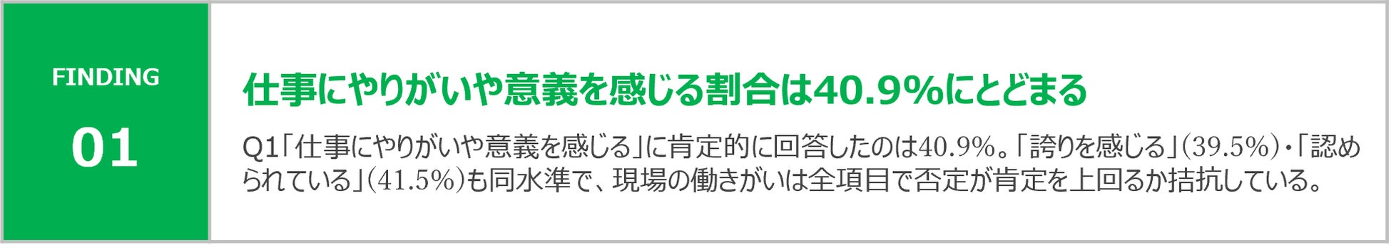 「今の仕事に前向きに取り組んでいる」は肯定41.5%と比較的高いが、「仕事に誇りを感じる」の否定層が約31%と高く、意欲と自己肯定感が連動していない点が特徴的
