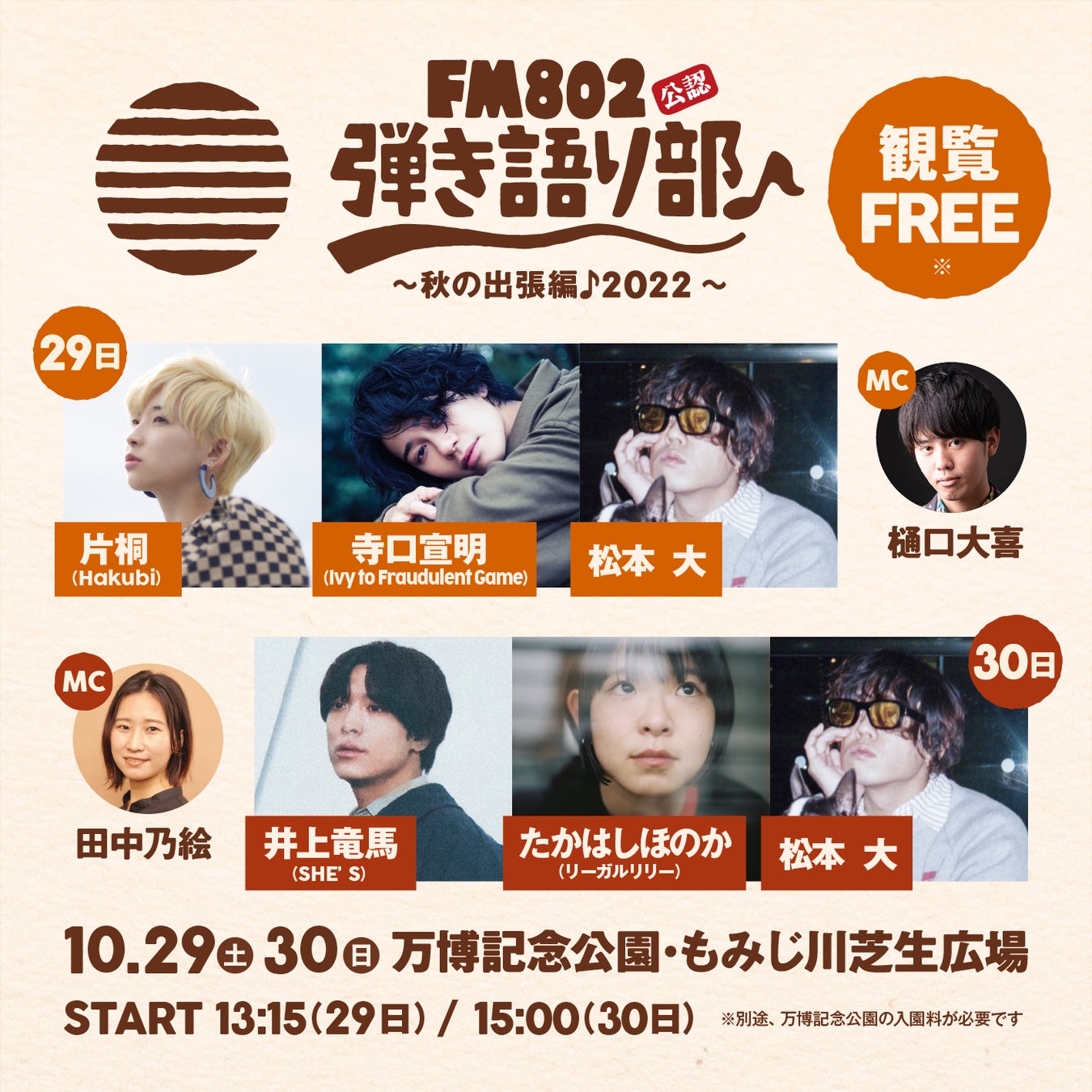 井上竜馬(SHE'S)、片桐(Hakubi)、たかはしほのか(リーガルリリー)、寺口宣明(Ivy to Fraudulent Game)、松本 大 出演、観覧無料のFM802弾き語り部開催決定!