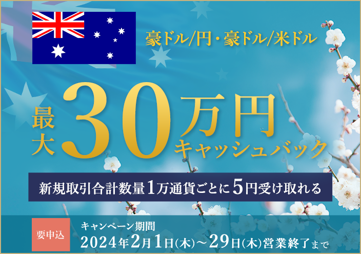 キャンペーンに申し込まれたお客さまに、期間中における豪ドル/円と豪ドル/米ドルの新規取引合計数量に応じて、最大300,000円をキャッシュバックします。