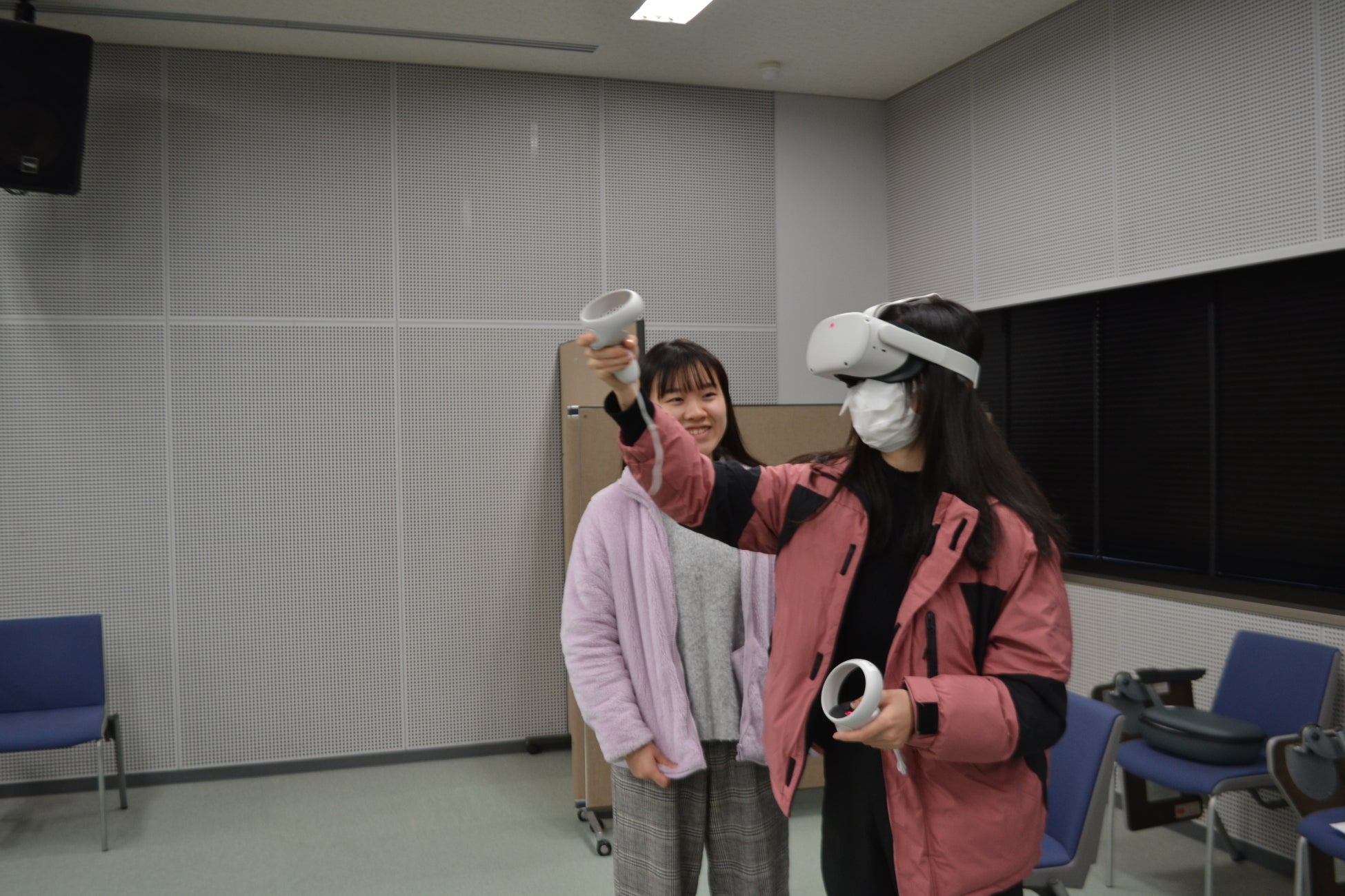 国際関係コースの賀来美夕季さんは「通常の英語クラスでは、他のクラスメートに見られているので、間違いを恐れてしまい口数が少なくなってしまうが、VRだと安心して話せるので、たくさん練習できた」とVRを使った英語スピーキング学習への効果を述べました。
