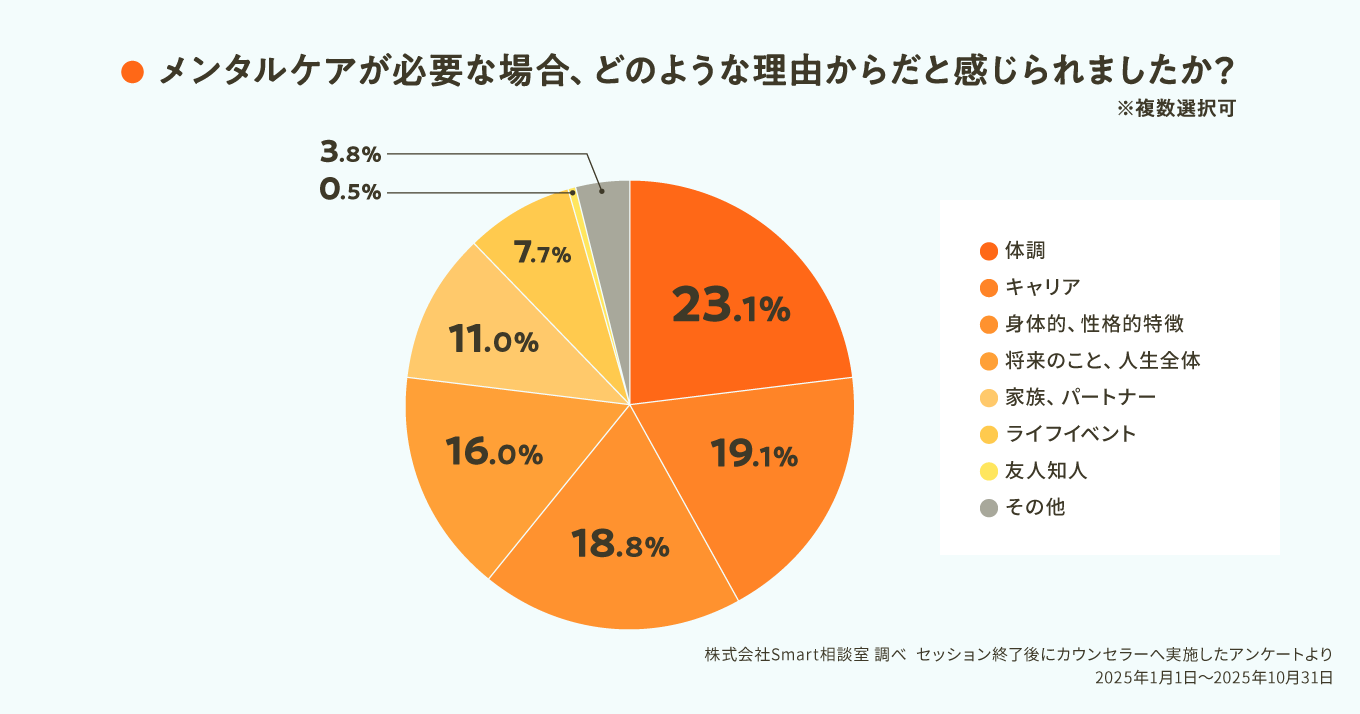 一方で、カウンセラーが「メンタルケアが必要」と判断した相談者は約22%でした。その理由としては、「体調」が23.1%と最も多く、メンタル不調が身体症状に現れるほど深刻な状態の方からの相談が一定数あることがわかります。また、「身体的・性格的特徴」を背景にメンタルケアが必要と判断されたケースも18.8%と比較的多く見られました。さらに、「キャリア」(19.1%)や「将来のこと、人生全体」(16.0%)といった未来に関する不安がメンタル不調の要因になっていると考えられる人も約3.5割にのぼりました。
