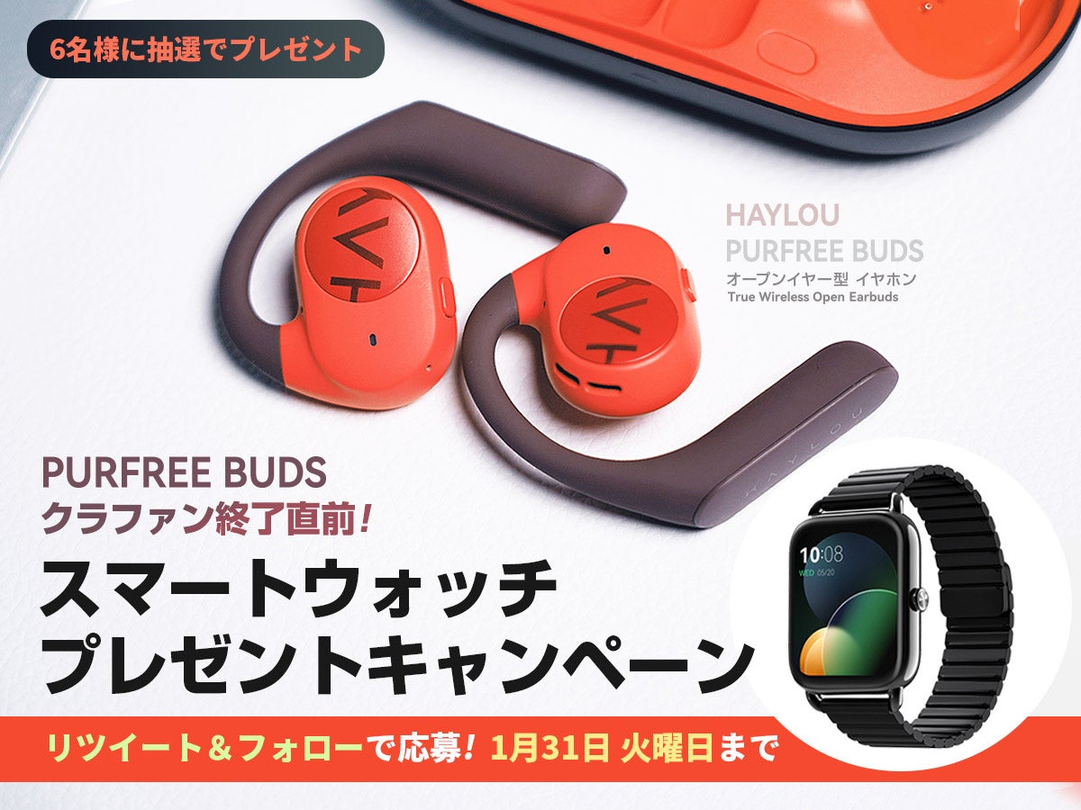 Haylou(ハイロー)は、新商品オープンイヤーイヤホン「PurFree Buds(ピュアフリーバッズ)」がクラウドファンディングにて、800万円を突破した記念として、Twitterでスマートウォッチプレゼントキャンペーンを開催中です。