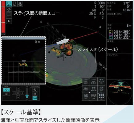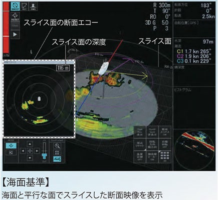 今回受賞した水中探知装置は、3次元探知を行う水中探知装置の表示方法に関して、探知された魚群を任意の断面エコーデータを表示することができます。従来、透過処理を施した3次元の魚群映像を様々な方向から俯瞰する表示方法等がありましたが、魚群内部の魚の分布状況を正しく把握しづらい課題がありました。