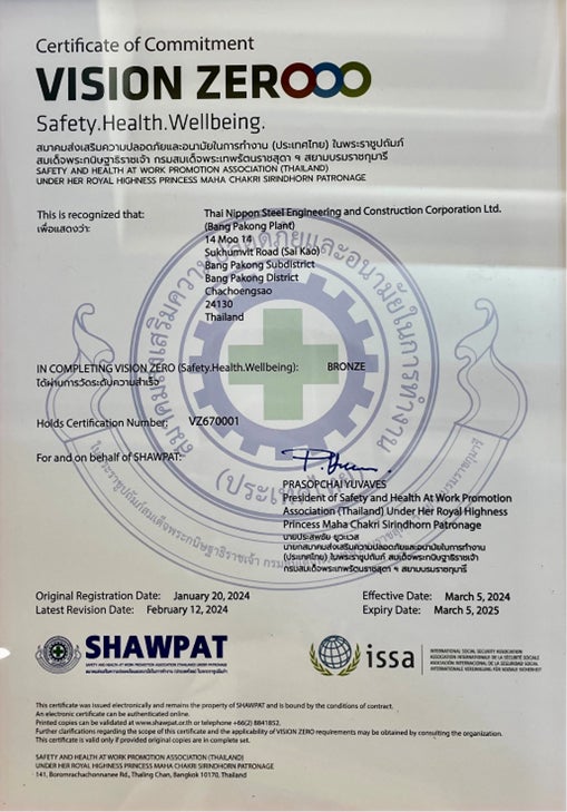 日鉄エンジニアリング株式会社(代表取締役社長:石倭行人、本社:東京都品川区、以下「当社」)の連結子会社であるTHAI NIPPON STEEL ENGINEERING & CONSTRUCTION CORPORATION, LTD.(代表取締役社長:渡辺正弥、以下「TNS」)の取り組みが、国際社会保障協会(International Social Security Association、以下「ISSA」)※1およびISSAに所属するタイ労働安全衛生促進協会(The Safety and Health at Work Promotion Association Thailand、以下「SHAWPAT」)※2から、「VISION ZERO」の認定を受けましたのでお知らせいたします。