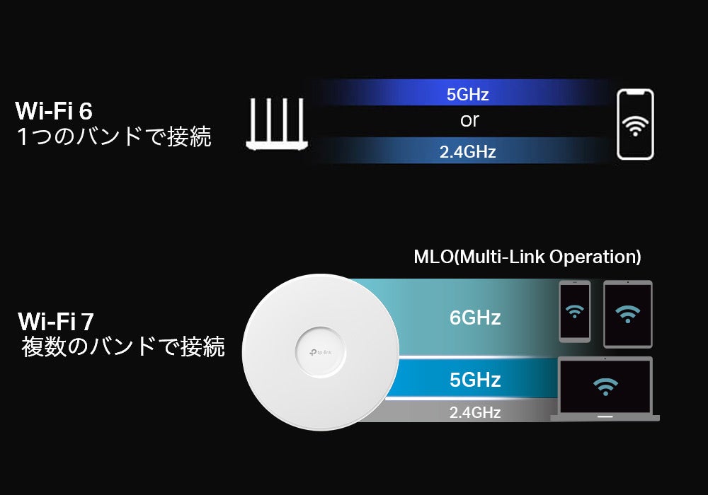 なかでも「MLO」技術は、複数のバンドとチャンネルでデータを同時に送受信可能にします。これにより、旧規格のようなシングルリンクでの通信によって生じていた通信リソースの無駄を解消します。