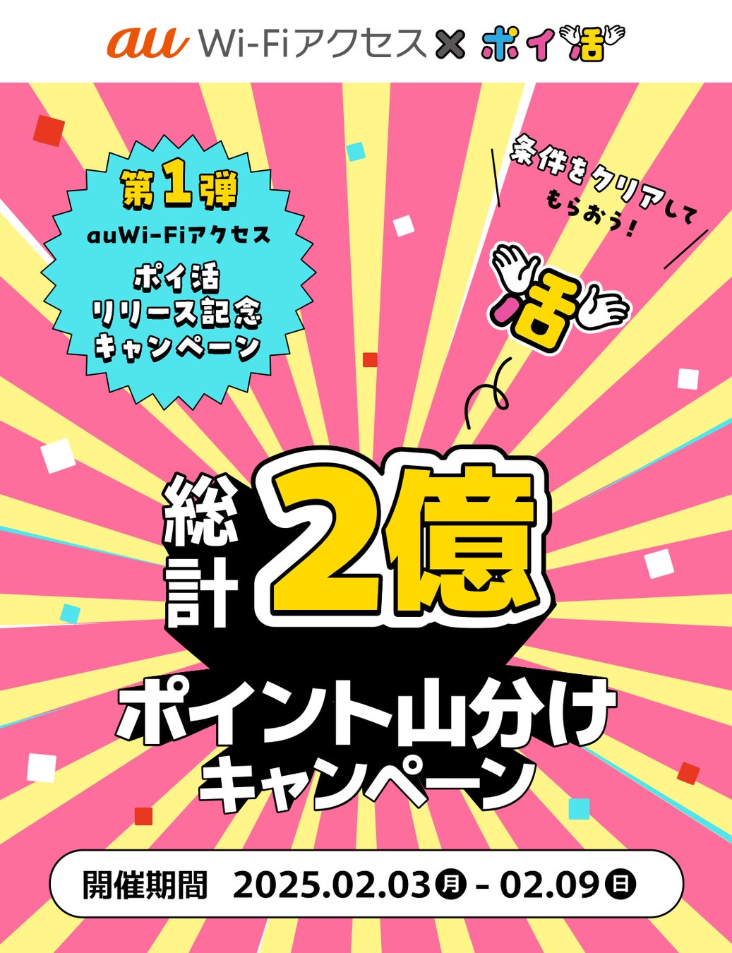 ・対象期間中、最新版のau Wi-Fiアクセスアプリから「ポイ活サービス」を初めて開始されたお客さまを対象に、もれなくau Wi-Fiアクセス独自ポイントを山分けして還元します。 ・山分けポイント数 第1弾期間:2億ポイント(200万円相当) 第2弾期間:1億ポイント(100万円相当) ※山分けポイント数はおひとりさま上限10,000ポイントまでとなります。 ※ポイントの配布は2025年3月中を予定しています。 |