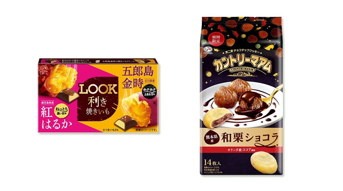 不二家のロングセラー「ルック」「カントリーマアム」より、秋の味覚を楽しめる新商品が登場します。焼きいもや和栗のおいしさをチョコと組み合わせた、今だけの限定商品です。
