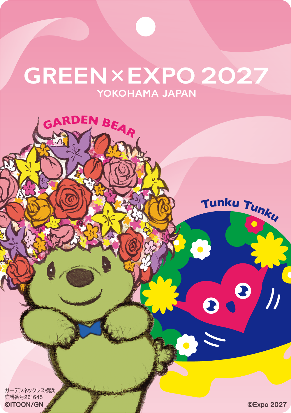 ガーデンネックレス横浜のマスコットキャラクター「ガーデンベア」と、「トゥンクトゥンク」が仲良くそろった限定デザインのコラボレーションチケットが公式ライセンス商品として登場します。ストラップがついたカード型で、GREEN×EXPO 2027会場内では首からかけて楽しむことができ、来場後も記念として手元に残すことができます。