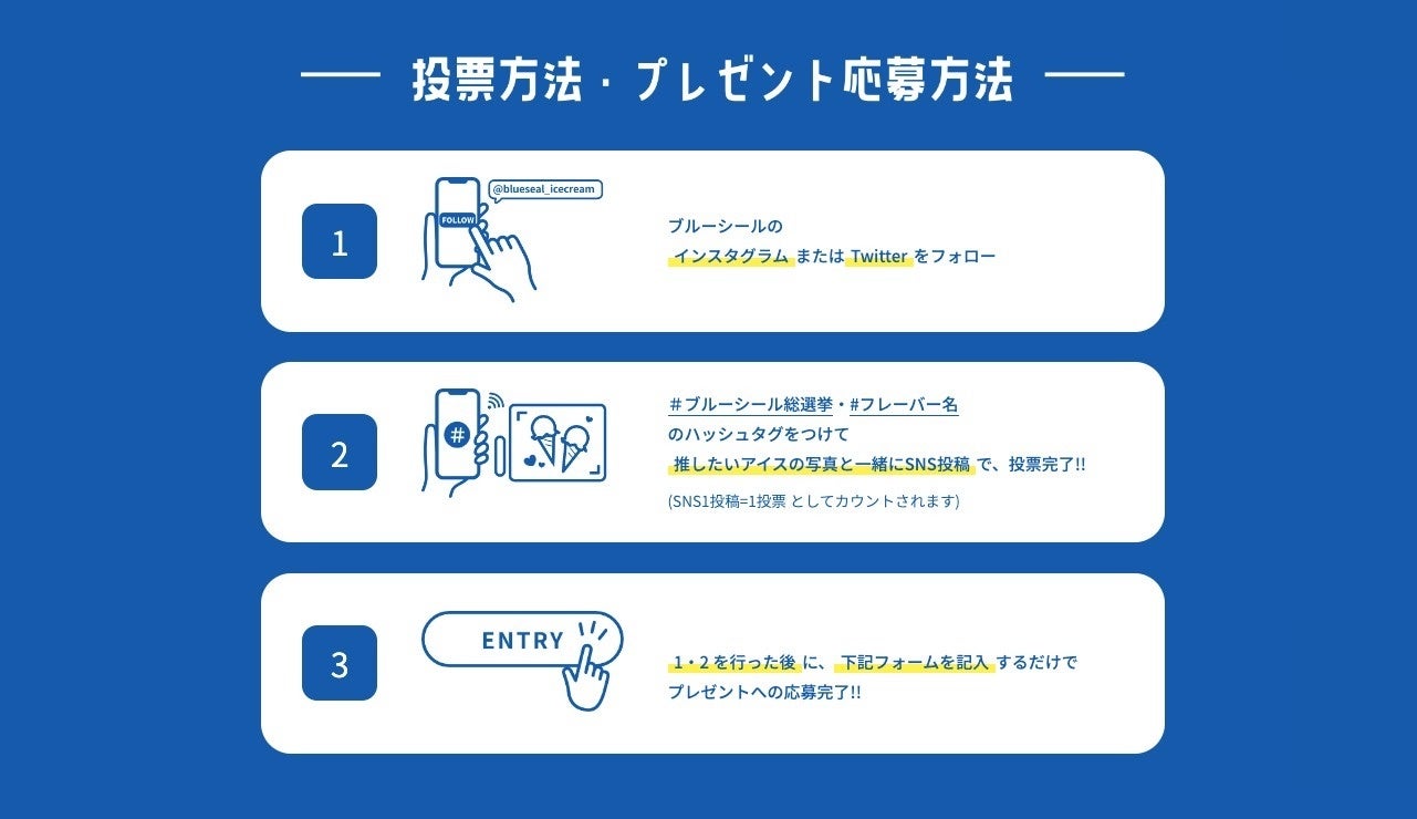 2.「#ブルーシール総選挙」&「#フレーバー名」※のハッシュタグをつけて推したいアイスの写真と一緒にSNS投稿で投票完了!