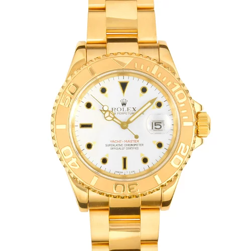 ロレックス(ROLEX)の中でも高級ラインに位置するヨットマスターです。金無垢に浮かぶ白文字盤が美しくラグジュアリーな一品です。