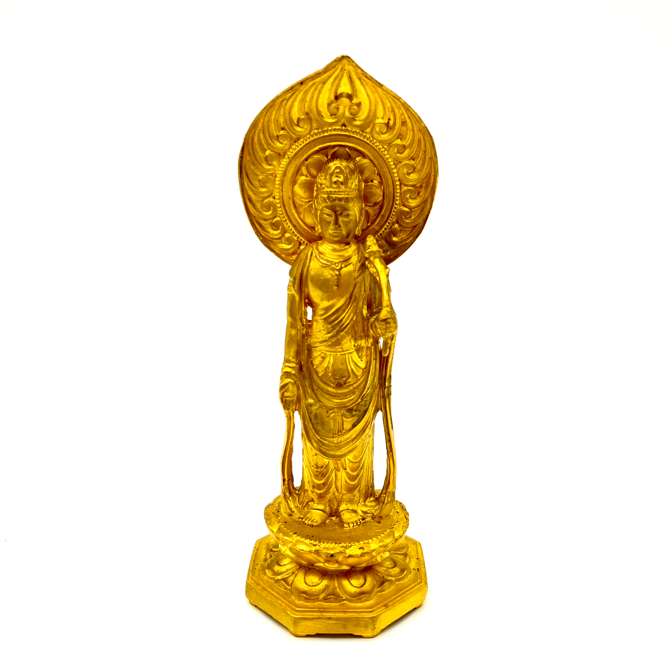 純金素材の仏像・菩薩です。髪が結い上げられた女性のような姿が菩薩の特徴とされています。仏像は大きく分けて如来、菩薩、明王、天の4つが存在しており、法隆寺の釈迦三尊像は如来に該当します。