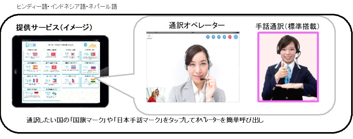 「みえる通訳」は、外国人や聴覚障がい者の方の円滑なコミュニケーションを支えるため、スマートフォンやタブレットを利用し、テレビ電話形式でオペレーターがリアルタイムで通訳を行う映像通訳サービスです。