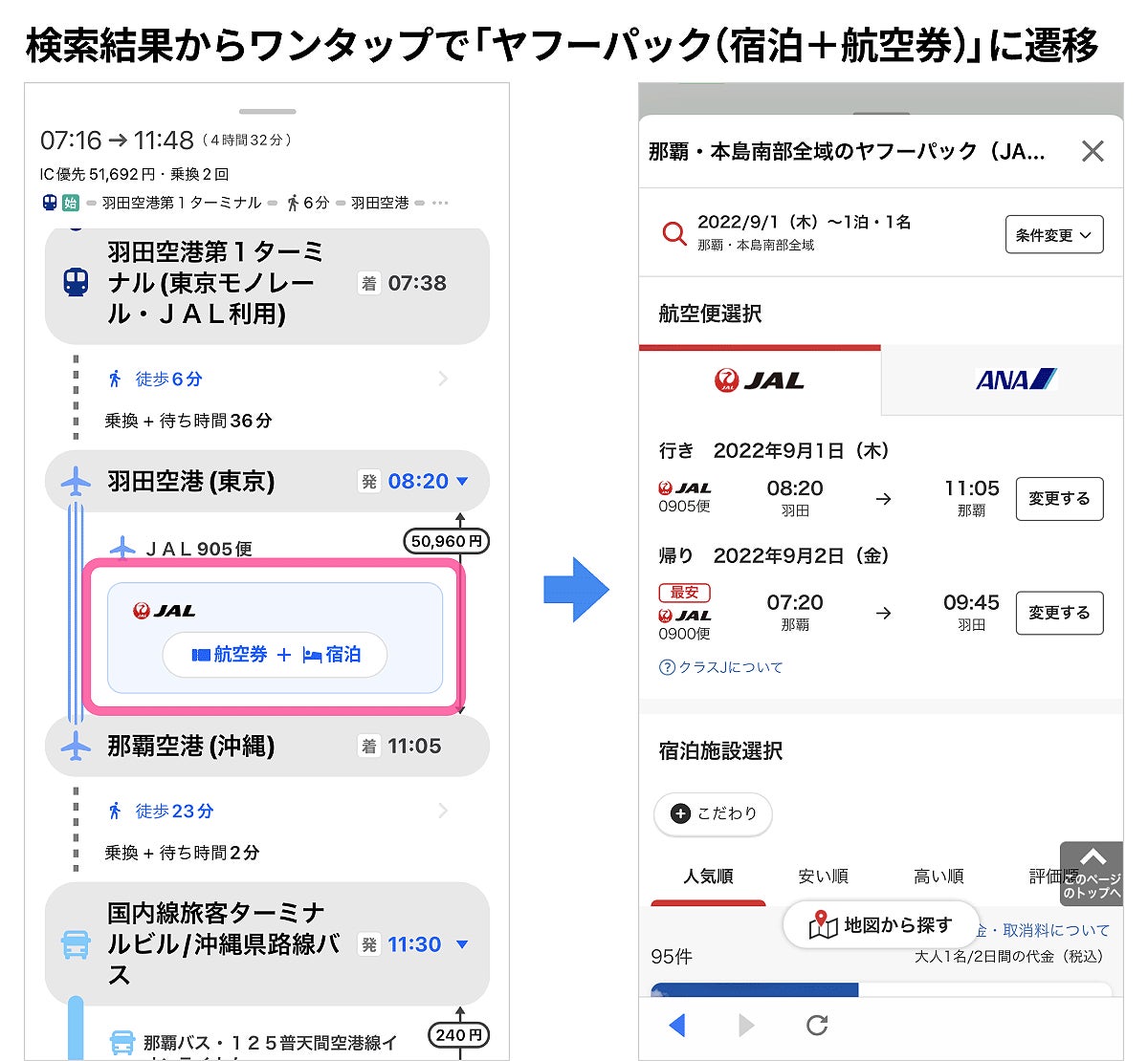 ・検索結果からワンタップで「ヤフーパック(宿泊+航空券)」に遷移(※2)