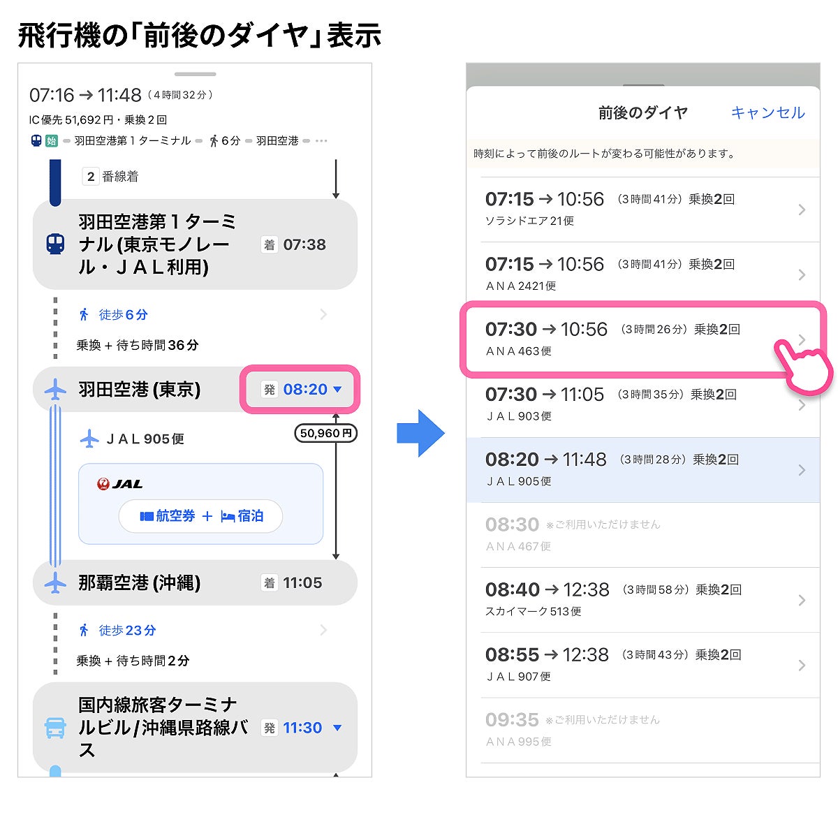 ルートの詳細画面で飛行機の出発時刻をタップすると、前後のダイヤが表示され、確認したい便を選択すると、その便にあわせて全体のルートが自動的に再検索されます。
