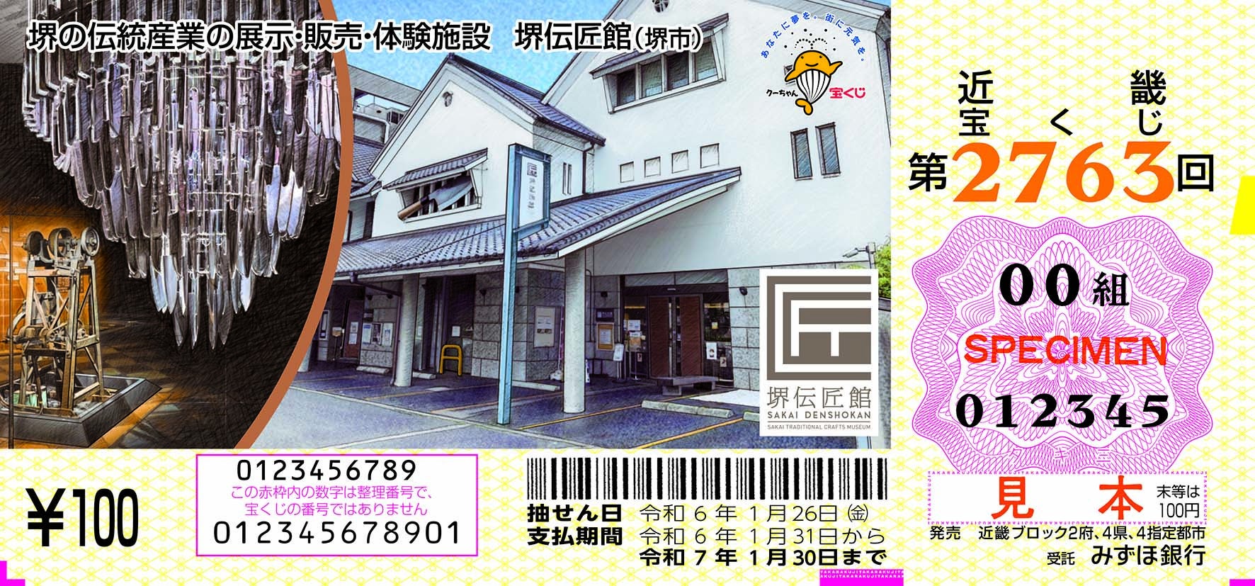 堺の伝統産業の展示・販売・体験施設である「堺伝匠館」と刃物で作られたシャンデリア「HIBANA」を描いた第2763回近畿宝くじが、以下のとおり発売されることになりました。