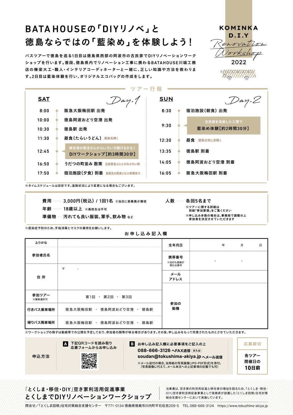 徳島への移住を検討されている方や空き家を自分の手で自分らしい住まいに改修してみたい方など、みなさまのご参加をお待ちしております。
