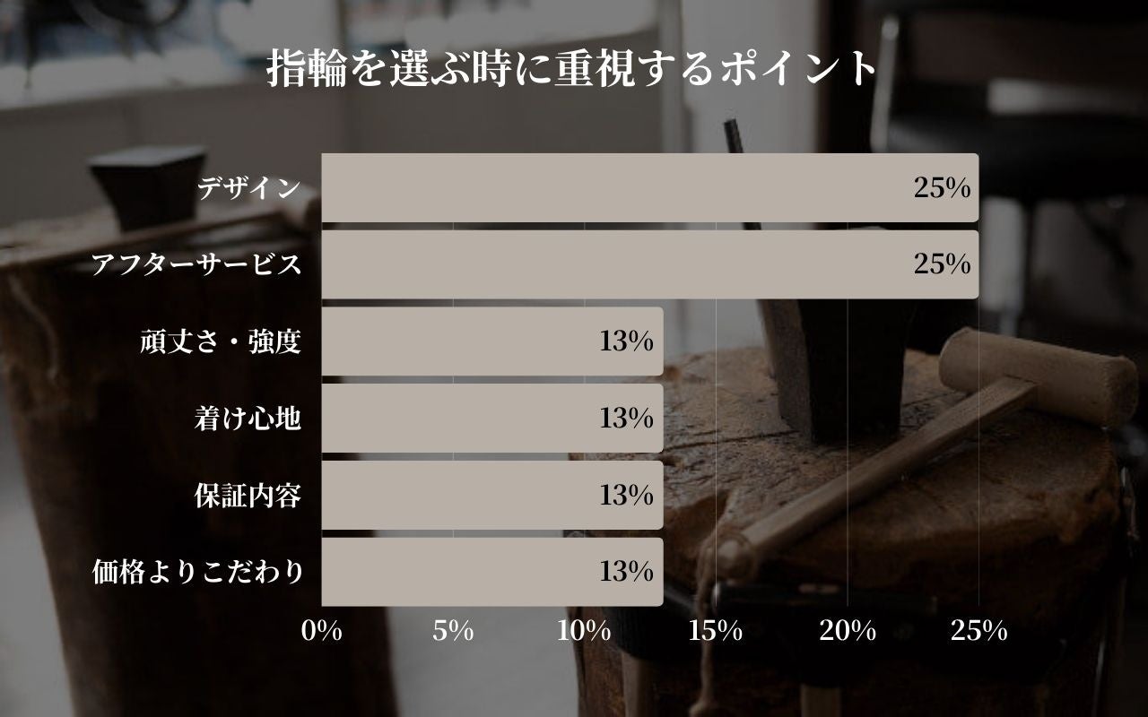 指輪を選ぶ際に最も重視されているポイントは、「デザイン」(25%)と「アフターサービス」(25%)が同率でトップとなりました。この結果は、お客様が指輪の「見た目の魅力」と「長期的な安心感」という二つの要素を、同等に重要視していることを明確に示しています。