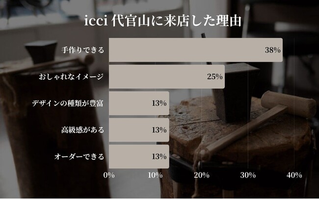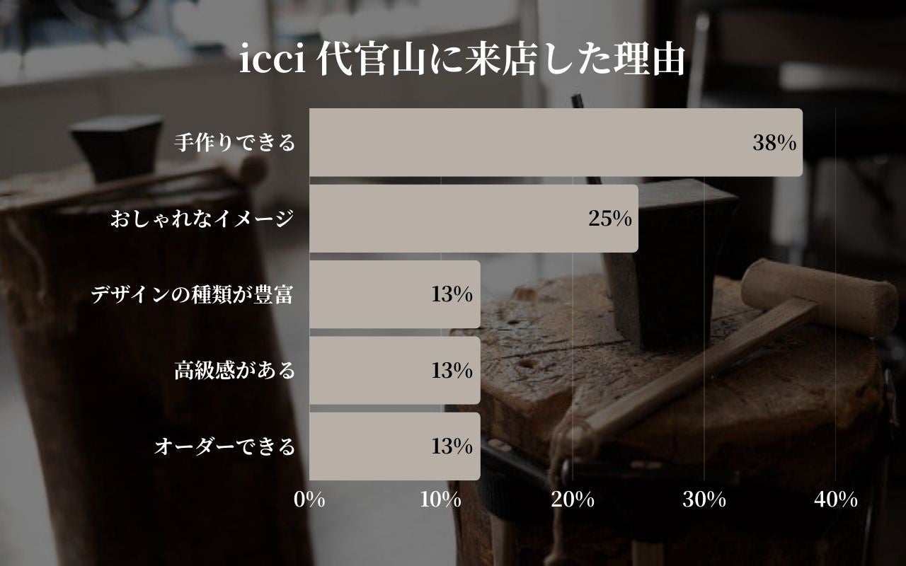 来店理由として「手作りできる」(38%)が引き続き最多となり、icci代官山の「体験価値」が最も強力な集客要因であることが確認されました。お客様は指輪の制作プロセスや思い出づくりに高い魅力を感じています。