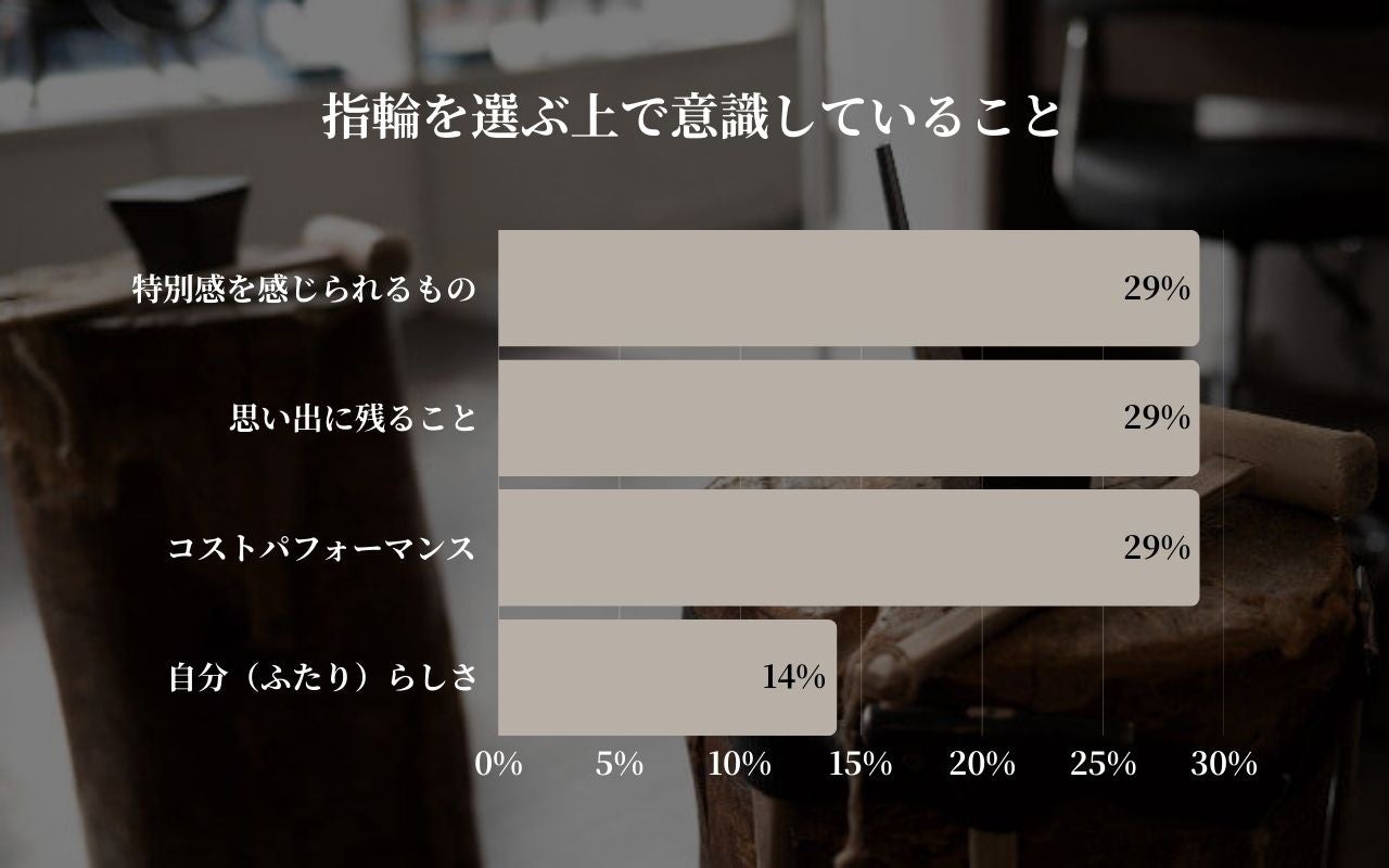 指輪を選ぶ上で意識していることとして、「特別感を感じられるもの」「思い出に残ること」「コストパフォーマンス」の3項目が同率(29%)で最多となりました。この極めて珍しい結果は、お客様の価値観が「感情的価値」と「合理的価値」の二つの軸の間で、均等に分散していることを示しています。
