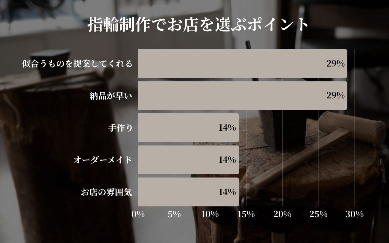 指輪制作でお店を選ぶポイントとして、「似合うものを提案してくれる」(29%)と「納品が早い」(29%)が同率で最多となりました。この結果は、お客様の選択基準が、体験そのものから「結果の確実性」と「利便性」へとシフトしていることを示唆しています。