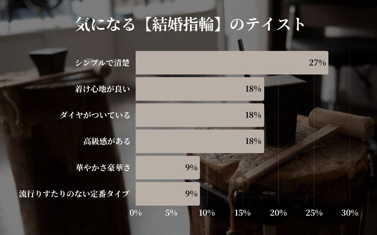 結婚指輪のテイストでは、「シンプルで清楚」(27%)が最多となり、日常的な着用と飽きのこない普遍的なデザインを求める傾向が引き続き強いことがわかります。