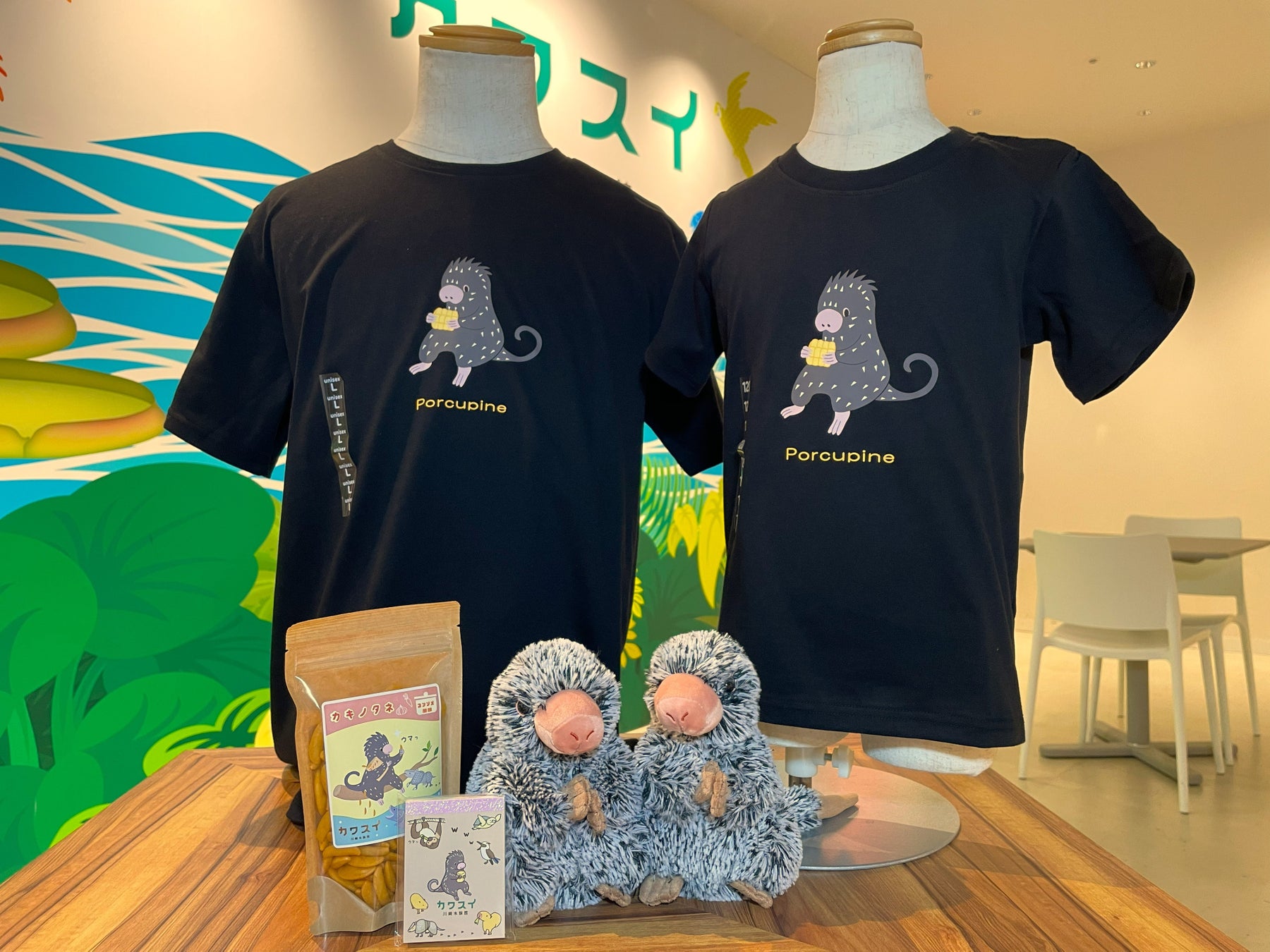 オマキヤマアラシがデザインされたグッズや抜け落ちた針などカワスイでしか買えないグッズを販売します。