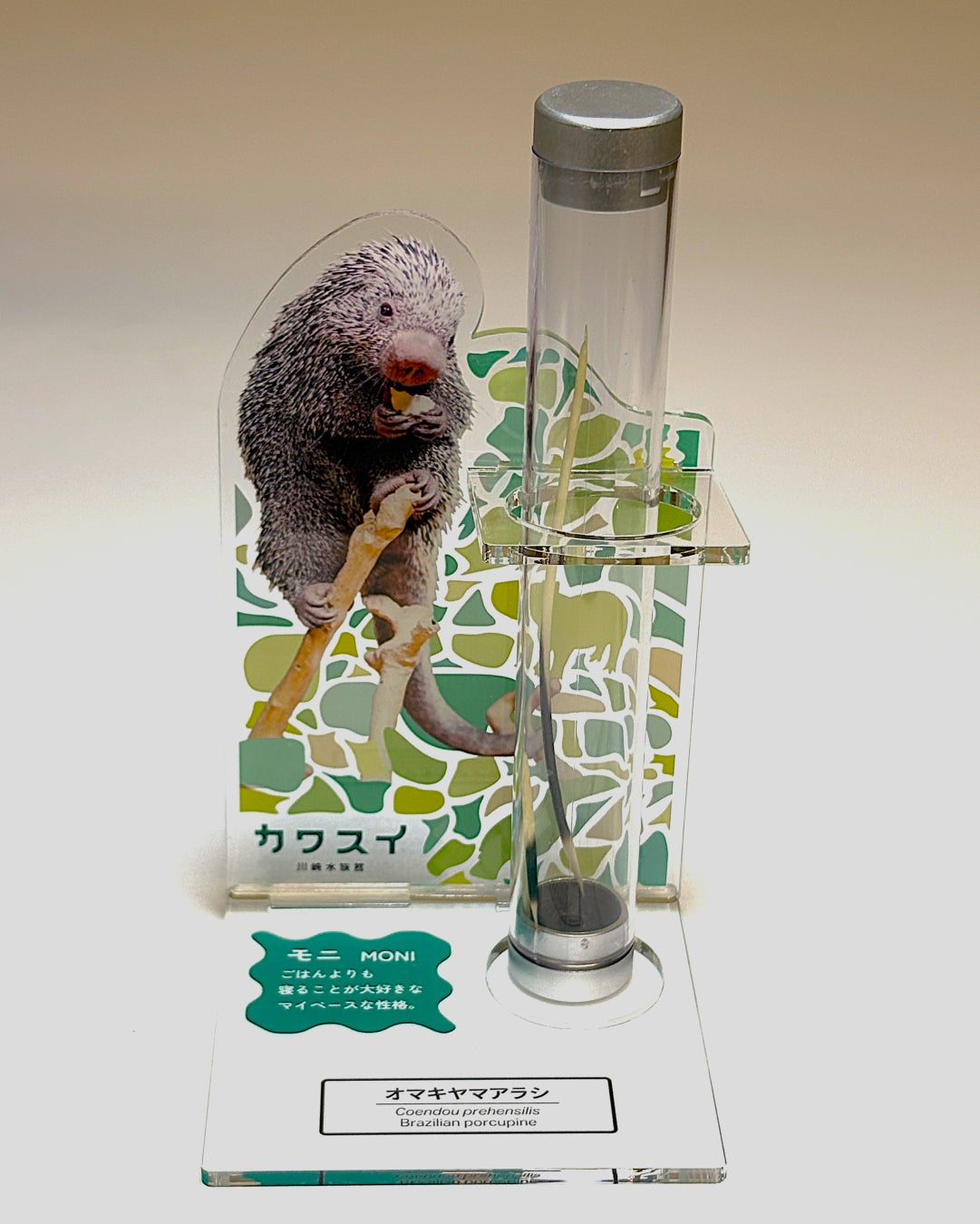 カワスイで展示されている、オマキヤマアラシのモニから抜け落ちた本物の針を標本として飾れるアクリルスタンド。