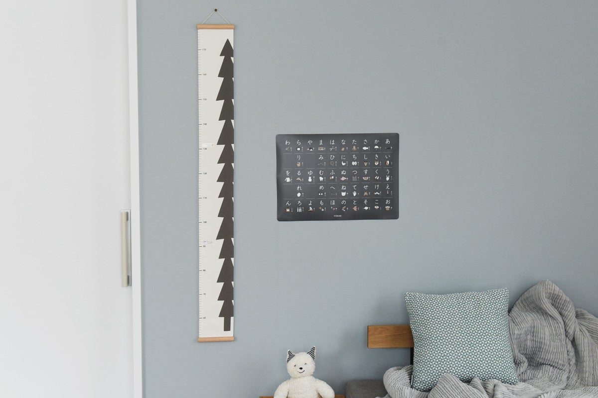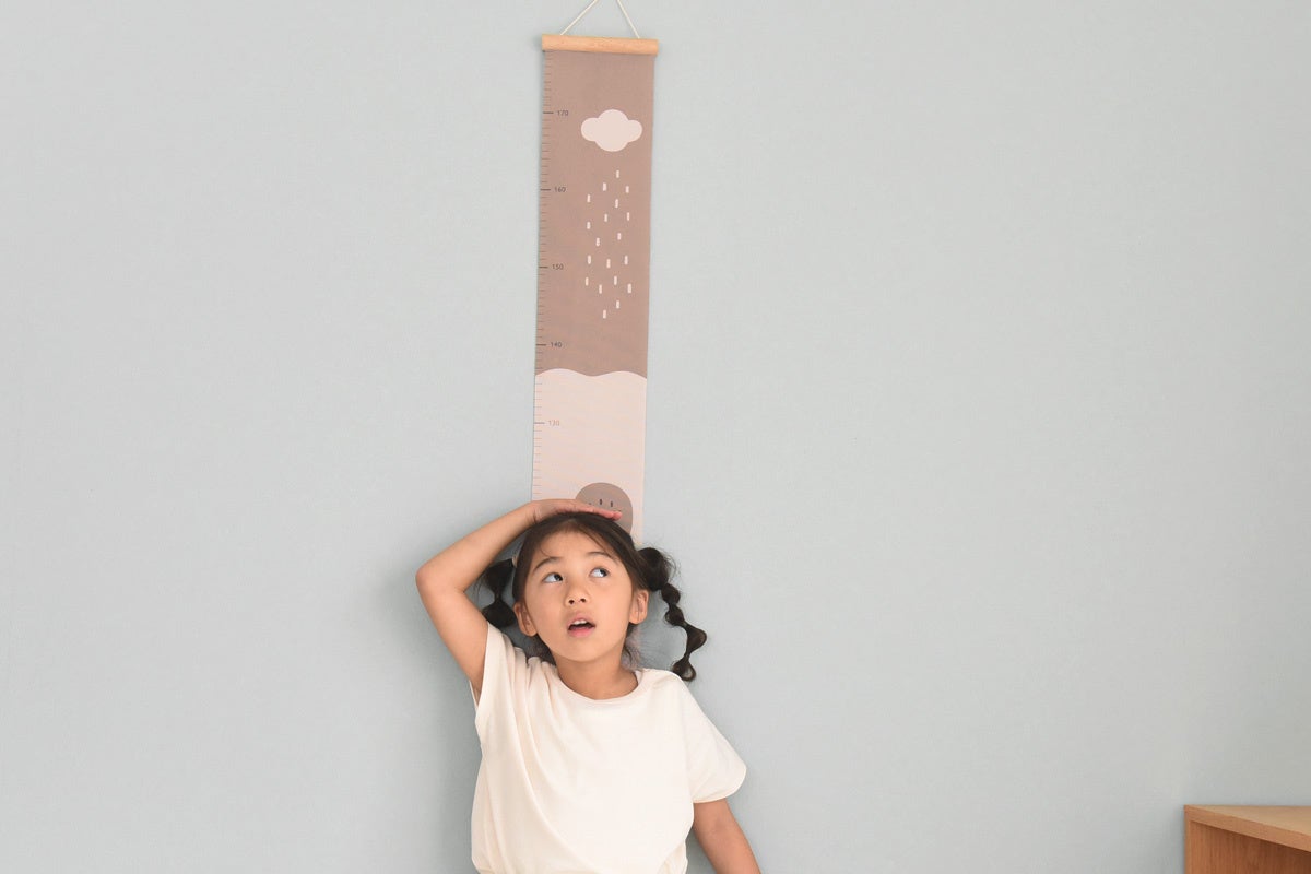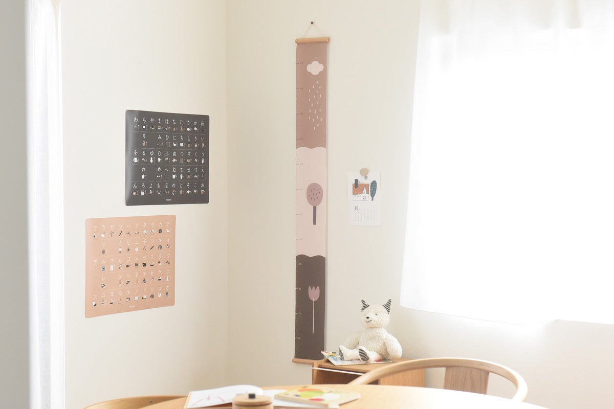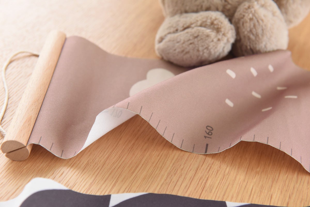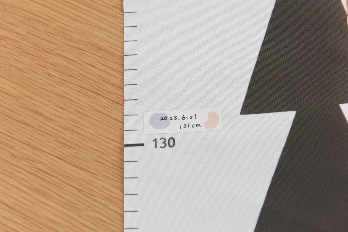 壁に貼ったタペストリーで身長を測り、日付などを書き込めば、何度も見返せる成長記録に。